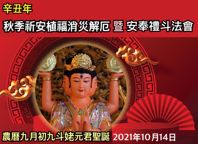 本堂訂於農曆九月初九(國曆10月14日)斗姥元君聖誕為秋季祈安植福消災解厄暨安奉禮斗法會,斗姥元君,又稱斗姆、斗母或先天道母。乃元始天尊之先天陰氣,托化西竺國中,為周御王之妃,號「紫光夫人」。